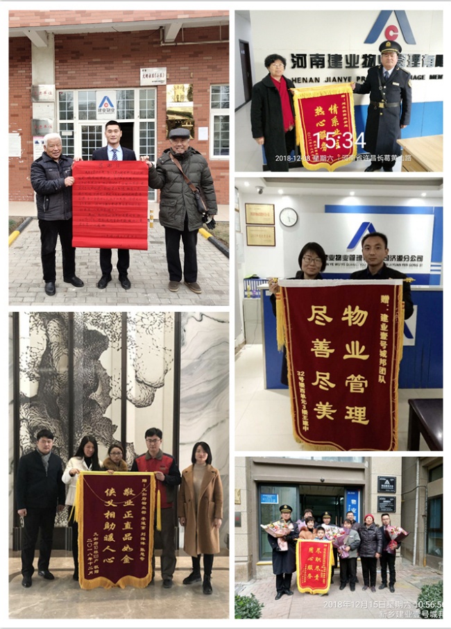寒風刺骨、呵氣如霜的12月,建業(yè)物業(yè)人一如既往地堅守在各個崗位上,從點滴之處關心幫助業(yè)主,為業(yè)主帶來暖心服務。2018年12月,全省各地共涌現(xiàn)出拾金不昧、技術高超、服務熱情、助人為樂等好人好事共222例,其中,收到錦旗78面、感謝信114封、致電感謝32起。