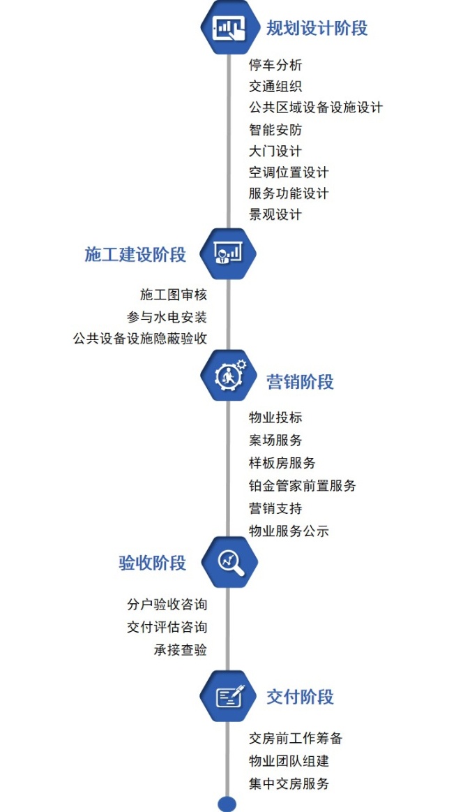 隨著房地產(chǎn)市場的日趨成熟,業(yè)主對房屋設(shè)計與物業(yè)管理的品質(zhì)提出了更高的要求。建業(yè)物業(yè)前期介入部參與到項目開發(fā)的全生命周期,圍繞客戶使用、物業(yè)管理及開發(fā)商需求等角度提出合理化建議,力爭將客戶的訴求呈現(xiàn)在設(shè)計期,將客戶的痛點消滅在交房前,提升客戶對產(chǎn)品與物業(yè)服務(wù)的滿意度。建業(yè)物業(yè)前期介入服務(wù)分為規(guī)劃設(shè)計、施工、營銷、驗收和交付5個階段,涉及23項重點工作內(nèi)容。