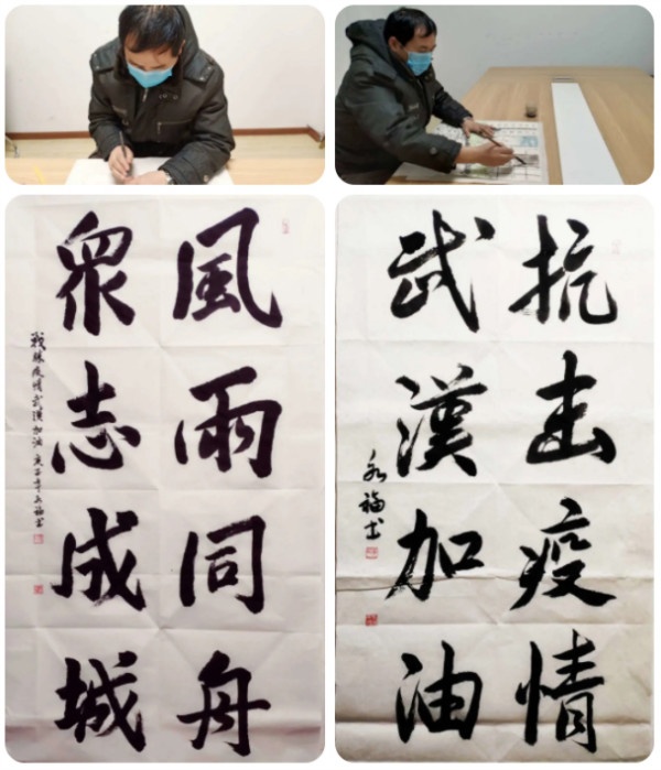 除了創(chuàng)作防疫宣傳畫冊,李永福還揮毫潑墨,書寫“抗擊疫情,武漢加油”、“眾志成城,風雨同舟”等文字,表達對武漢、對祖國的祝福。