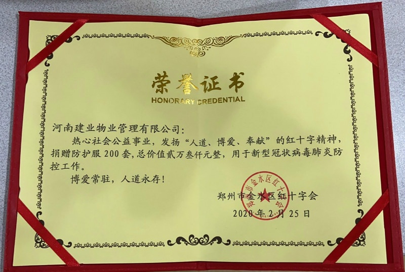 守望相助,共克時(shí)艱 | 建業(yè)物業(yè)向鄭州市金水區(qū)紅十字會捐贈(zèng)防護(hù)服200套