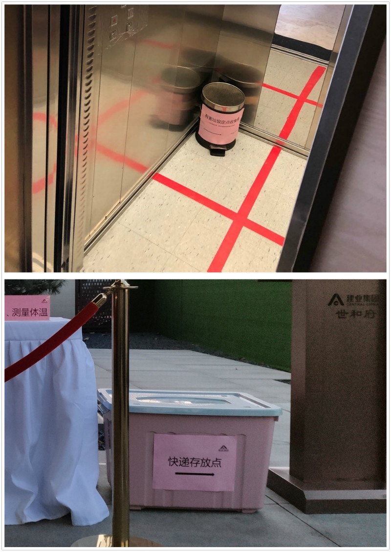 合理規(guī)劃分區(qū):電梯間張貼安全分區(qū)線,案場外圍設(shè)置快遞、外賣臨時存放處。所有物品存放前必須進行消毒處理,確認安全后通知員工自取。