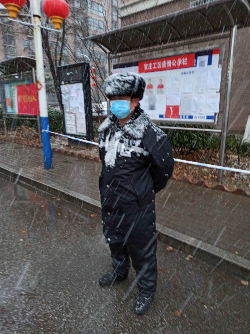 不巧的是,泰山小區(qū)值班室因電路故障無(wú)法正常取暖,室外大雪紛飛,室內(nèi)寒氣逼人。但南陽(yáng)魏崗片區(qū)的禮兵沒(méi)有一人因寒冷而離開(kāi)崗位,他們面迎寒風(fēng),身披雪花,對(duì)出入小區(qū)車(chē)輛、人員檢查登記和往常一樣認(rèn)真。他們堅(jiān)定內(nèi)心、堅(jiān)守崗位,將時(shí)刻守護(hù)業(yè)主的責(zé)任牢牢地扛在肩上。