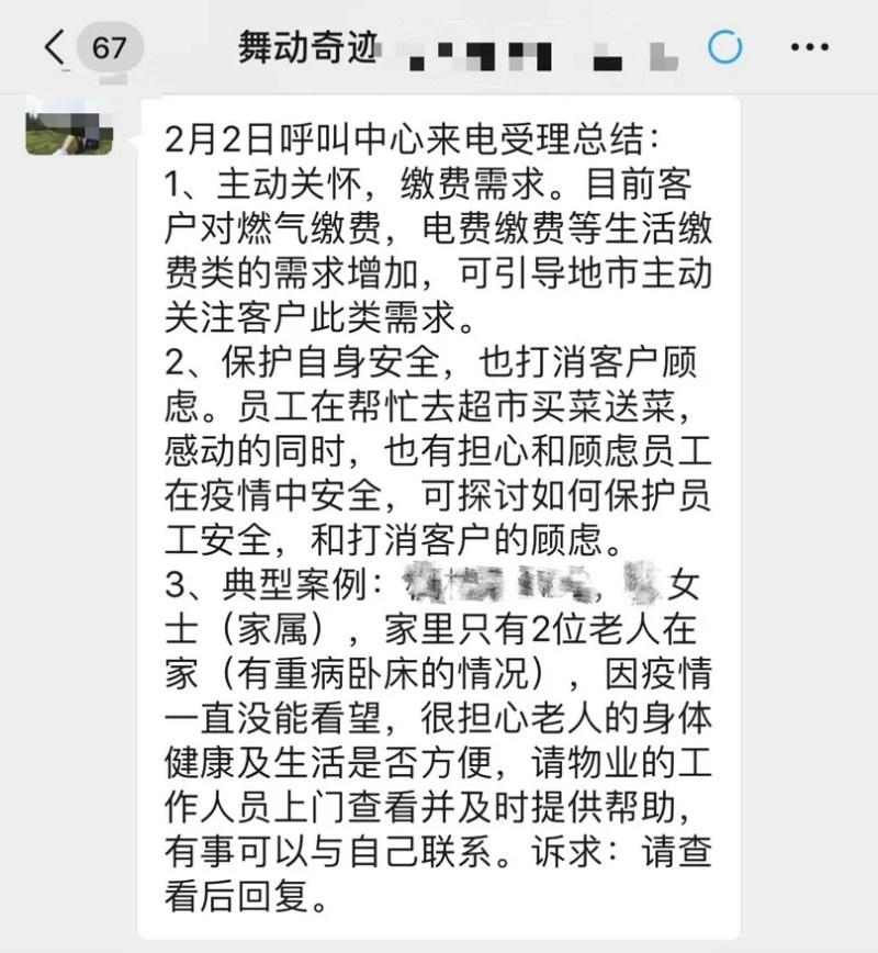 幾位獨(dú)居老人在家自我隔離期間藥品或生活物品短缺,反饋給呼叫指揮中心后,建業(yè)物業(yè)敏銳的捕捉到疫情期間全省中老年人的特殊需求,主動(dòng)關(guān)懷、主動(dòng)服務(wù),組織全省各個(gè)小區(qū)開始根據(jù)業(yè)主檔案篩選出重點(diǎn)關(guān)懷對(duì)象,并在疫情時(shí)期提供特殊關(guān)懷,解決了多位老人的后顧之憂。