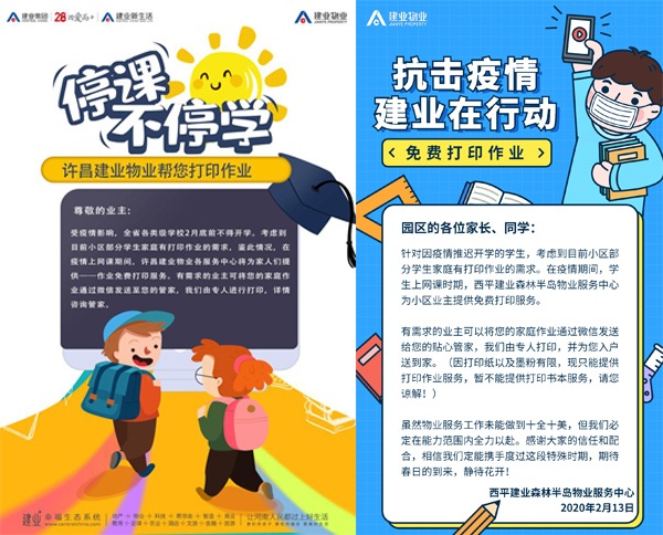 因為疫情影響,新學(xué)期開學(xué)時間推遲,為了不耽誤孩子的學(xué)習(xí),不少學(xué)校采取了線上教學(xué)的模式。建業(yè)物業(yè)也未停下腳步,免費打印作業(yè)、代買學(xué)習(xí)用品、寄送學(xué)習(xí)資料……全力保障業(yè)主孩子在假期的學(xué)習(xí)質(zhì)量。