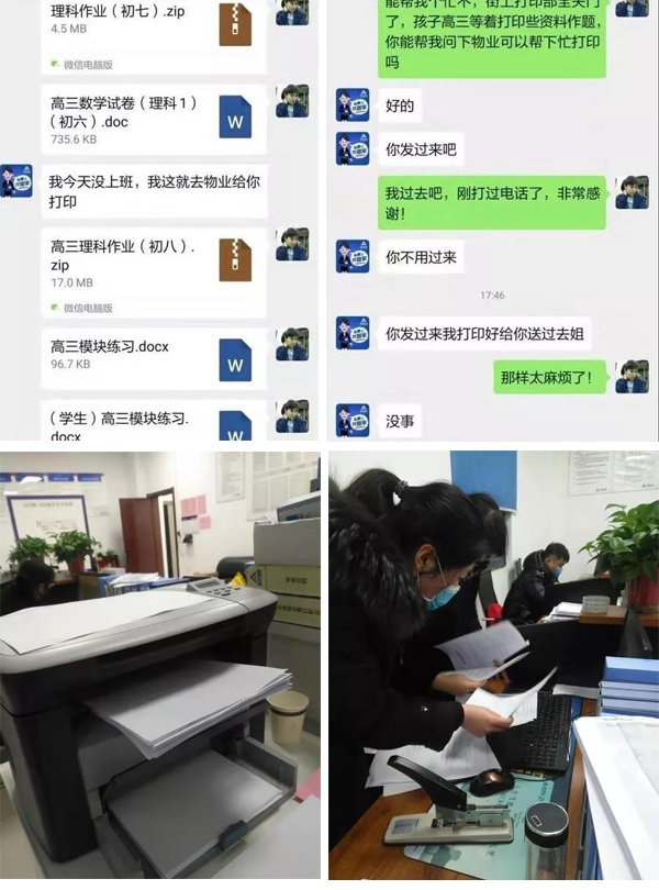 管家何利平知道趙女士的需求與顧慮后,便提出在晚上下班后幫助趙女士打印,就這樣,何利平與另兩位同事一起在下班后的夜晚,打印、分類、整理、裝訂,忙活了幾個小時,終于將三百多張試卷送到了業(yè)主的手中。事后,業(yè)主趙女士表示:住建業(yè),最幸福!疫情時期,我們小區(qū)的服務(wù)細致入微,無可挑剔,讓人安心、放心、感動。