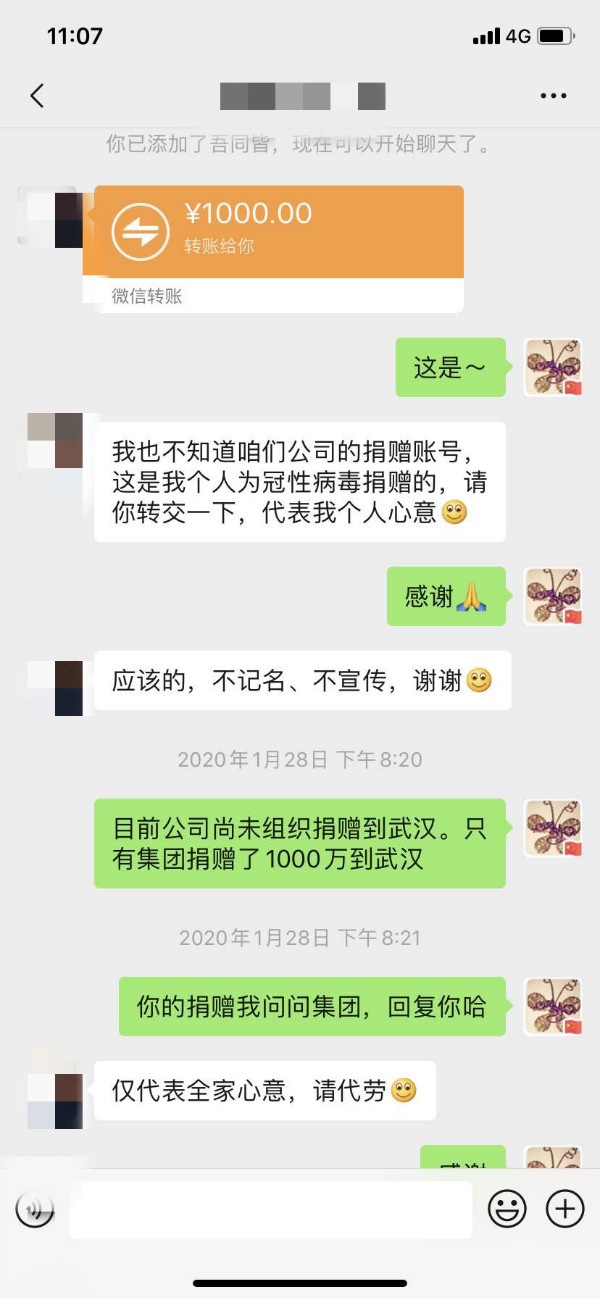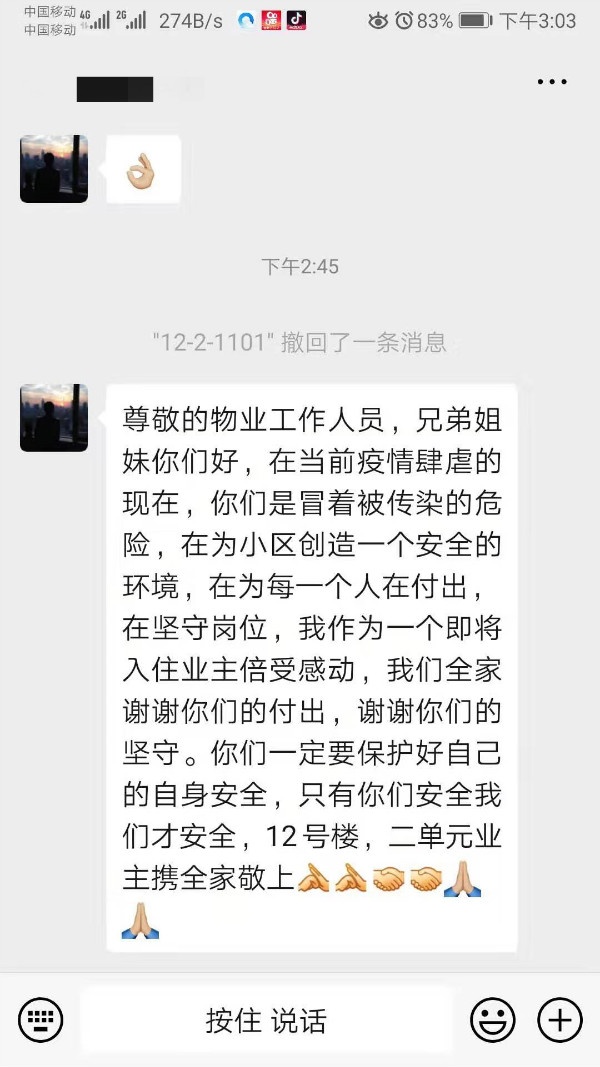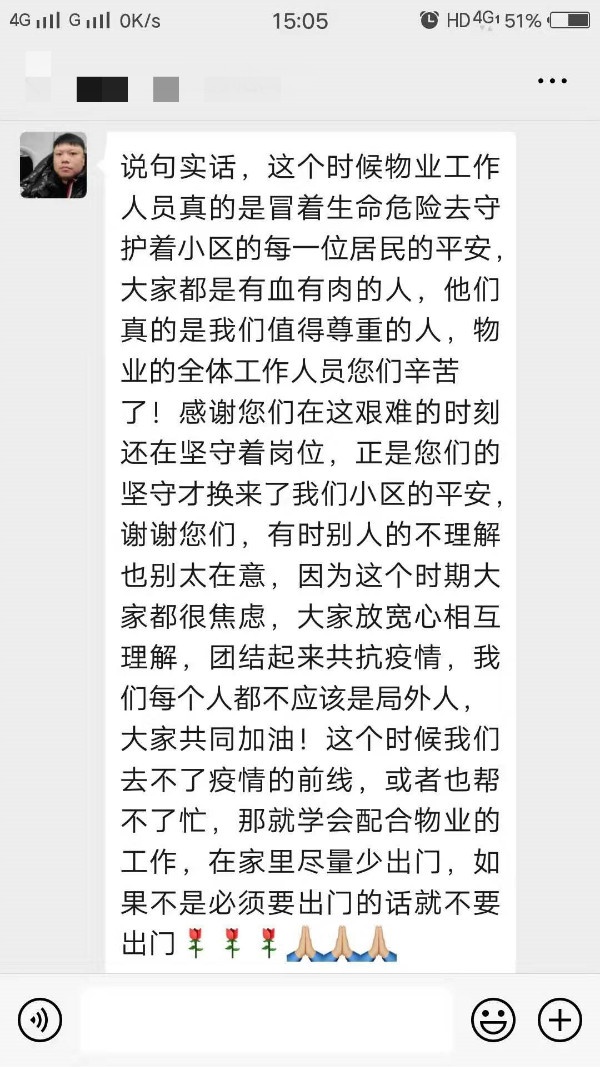 一位建業(yè)業(yè)主,同時(shí)也是集團(tuán)高層領(lǐng)導(dǎo),當(dāng)她看到奮戰(zhàn)在一線、可敬又可愛(ài)的建業(yè)物業(yè)人,每天每一時(shí)刻用血肉之軀,筑起業(yè)主安全的長(zhǎng)城時(shí),特別感動(dòng)、特別感謝,多次流下眼淚,特發(fā)來(lái)2萬(wàn)元紅包給一線的物業(yè)員工,助力物業(yè)防疫工作的進(jìn)行!