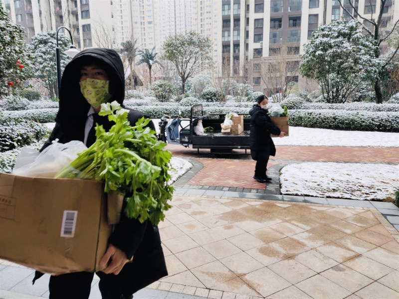 大雪紛飛,天寒地凍。建業(yè)物業(yè)管家一大早買來了新鮮蔬菜,正馬不停蹄地為業(yè)主配送。