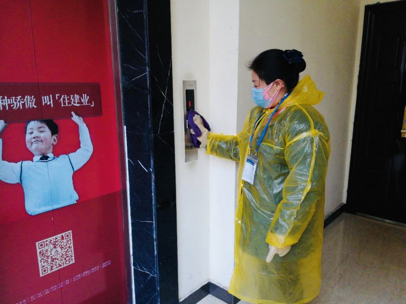 電梯按鍵最常被接觸到,對(duì)它循環(huán)消毒是保潔員每天要做的事,剛吃完午飯,平頂山十八城保潔員程利娟就趕到各個(gè)樓層對(duì)電梯按鍵進(jìn)行消毒。