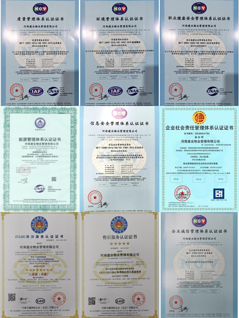 截至2021年1月21日,建業(yè)物業(yè)在原有的質(zhì)量、環(huán)境、職業(yè)健康安全、信息安全、社會(huì)責(zé)任、能源管理六標(biāo)認(rèn)證的基礎(chǔ)上,對(duì)清潔服務(wù)、售后服務(wù)、企業(yè)誠(chéng)信管理體系進(jìn)行相關(guān)認(rèn)證工作,并順利取得證書。