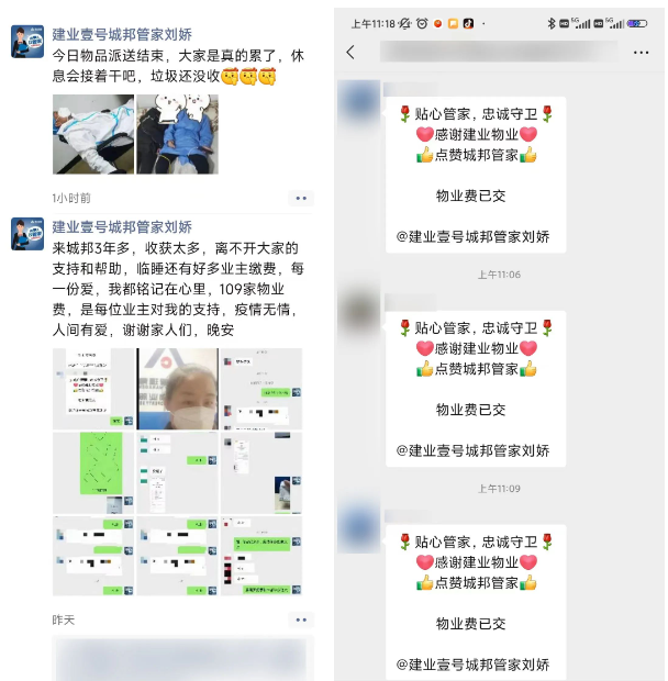 在一次日常溝通中,一名業(yè)主發(fā)現(xiàn)物業(yè)人連打地鋪的被子都少得可憐,便在業(yè)主群里號召大家支援物業(yè)。頓時,業(yè)主群里沸騰起來:“我家車庫里有折疊床,拿走用吧!”“我這兒有個大床墊,被子、枕頭都是干凈的!” “還需要被子嗎?有需要我過去?!薄按蠹矣辛Τ隽?,共度難關(guān),一切都會好起來的!”“這才是真真正正的建業(yè)一家親,為堅守崗位的物業(yè)及所有的熱心好鄰居點贊!”……一句句溫暖的話語,讓物業(yè)人內(nèi)心涌動著一股股暖流。