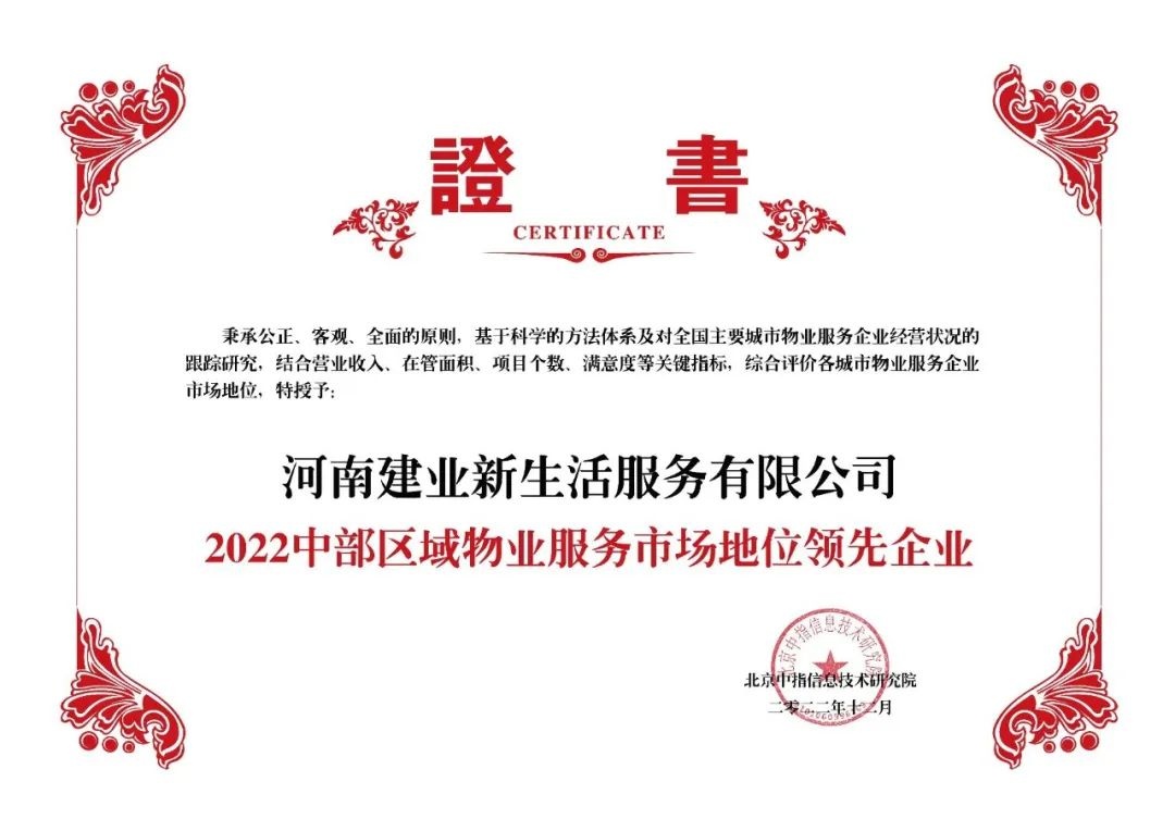 建業(yè)新生活憑借多年以來(lái)在中部地區(qū)穩(wěn)扎穩(wěn)打的表現(xiàn)榮獲“2022中部區(qū)域物業(yè)服務(wù)市場(chǎng)地位領(lǐng)先企業(yè)(TOP1)”“2022河南省物業(yè)服務(wù)市場(chǎng)地位10強(qiáng)企業(yè)(TOP1)”。