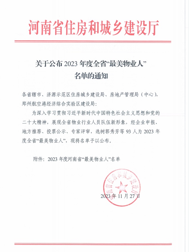 近日,建業(yè)物業(yè)及子公司林州六合物業(yè)、建業(yè)天明物業(yè)連續(xù)榮獲多項(xiàng)集體榮譽(yù)及個(gè)人榮譽(yù),充分體現(xiàn)了市場(chǎng)、行業(yè)與業(yè)主對(duì)建業(yè)物業(yè)的認(rèn)可與肯定。 2023年,建業(yè)物業(yè)始終將客戶需求放在首位,扎實(shí)做好基礎(chǔ)服務(wù),持續(xù)完善標(biāo)準(zhǔn)化體系建設(shè),創(chuàng)新開展多元服務(wù),持續(xù)聚焦業(yè)主需求。圍繞安保、保潔、綠化、維修等物業(yè)基礎(chǔ)服務(wù)及管家幸福服務(wù),打造專業(yè)化管理及執(zhí)行團(tuán)隊(duì),確保物業(yè)服務(wù)品質(zhì)及客戶滿意度穩(wěn)步提升,依托“建業(yè)+”幸福生態(tài)系統(tǒng),為業(yè)主提供時(shí)間、地域、功能無(wú)盲點(diǎn)的服務(wù),打造“好看、好玩、好用”的中原本地化生活平臺(tái)。 未來,建業(yè)物業(yè)將繼續(xù)堅(jiān)持服務(wù)至上的理念,不斷提升管理水平和服務(wù)質(zhì)量,為廣大業(yè)主提供更優(yōu)質(zhì)、便捷的物業(yè)服務(wù),在物業(yè)管理領(lǐng)域中不斷深入發(fā)展,為實(shí)現(xiàn)業(yè)主的美好生活持續(xù)奮斗。