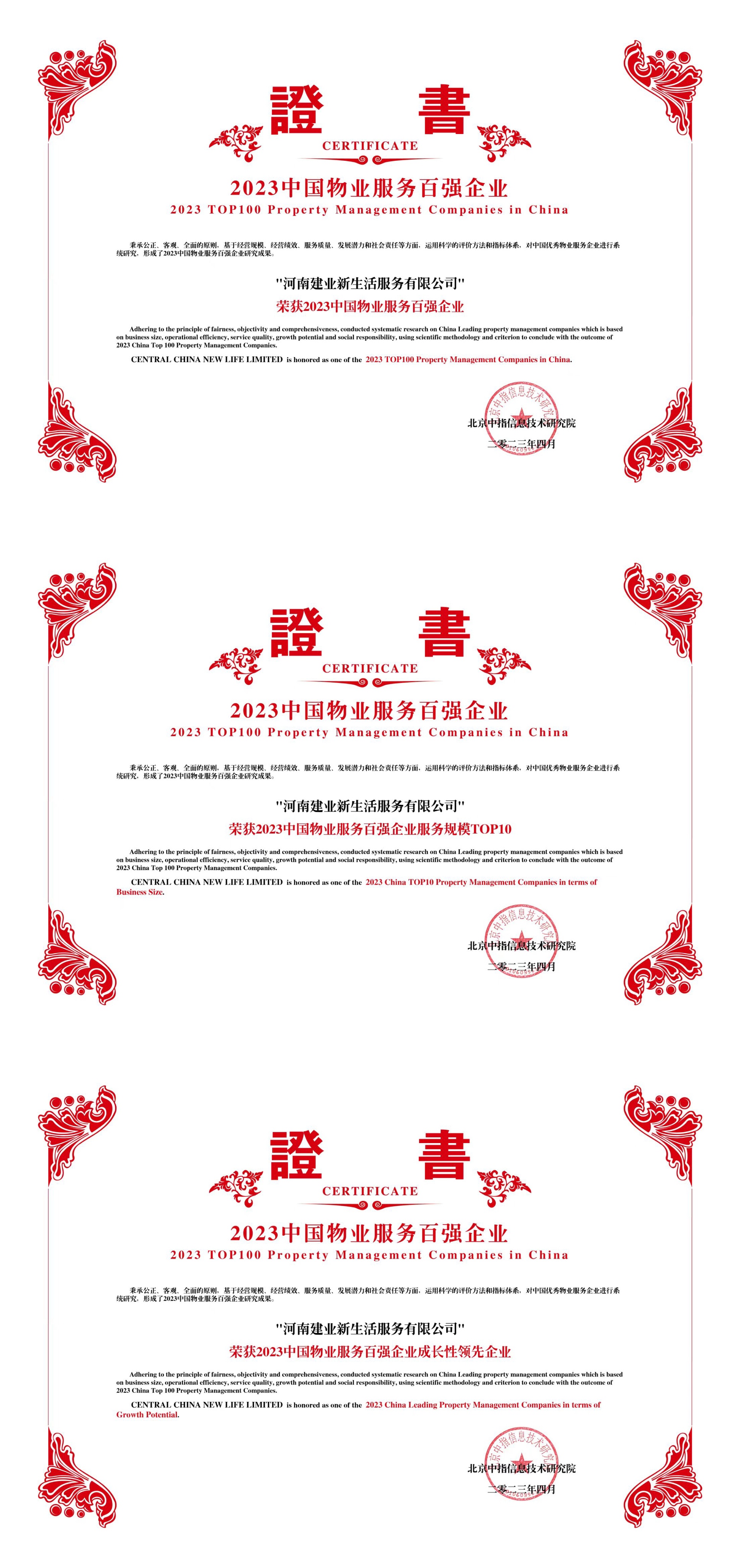 榮譽證書 豐富業(yè)態(tài) 貼心服務(wù) 增值服務(wù) 4月26日,由中指研究院、中國房地產(chǎn)TOP10研究組主辦的“2023中國物業(yè)服務(wù)百強企業(yè)研究成果會”在北京舉行。憑借雄厚的綜合實力及強勁的發(fā)展勢頭,建業(yè)新生活蟬聯(lián)“中國物業(yè)服務(wù)百強企業(yè)TOP11”“中國物業(yè)服務(wù)百強企業(yè)服務(wù)規(guī)模TOP10”,并獲得“2023中國物業(yè)服務(wù)百強企業(yè)成長性領(lǐng)先企業(yè)”榮譽稱號。同時,建業(yè)新生活旗下在管項目濮陽·建業(yè)世和府榮獲“2023中國物業(yè)服務(wù)行業(yè)示范基地”稱號,新鄉(xiāng)·建業(yè)壹號城邦、焦作·建業(yè)世和府榮獲“2023中國五星級物業(yè)服務(wù)項目”稱號。 作為中部地區(qū)領(lǐng)先的新型生活方式服務(wù)商,建業(yè)新生活